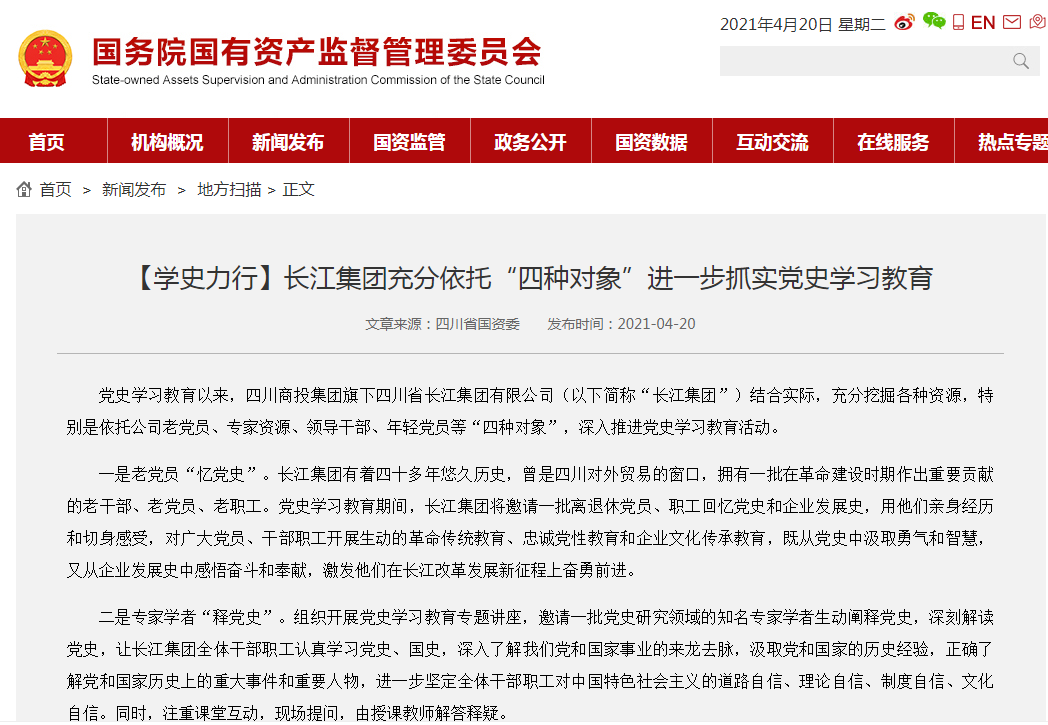 编者:近期,《长江集团充分依托“四种对象”进一步抓实党史学习教育》一文被国务院国资委和省国资委选用并刊发,长江集团结合实际,充分挖掘各种资源,深入推进党史学习教育。现将文章转发,供广大职工干部学习,抓实党史学习教育。