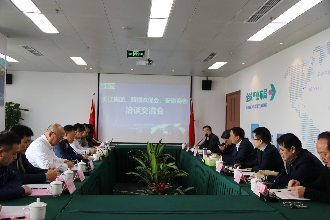 3月22日上午,长江集团与新疆农促会、安徽商会开展合作洽谈交流。集团党委书记、董事长陈春,商投品牌投资发展公司(筹)董事长赵毅,新疆农促会会长郭建军,安徽商会会长熊南奇出席会议。